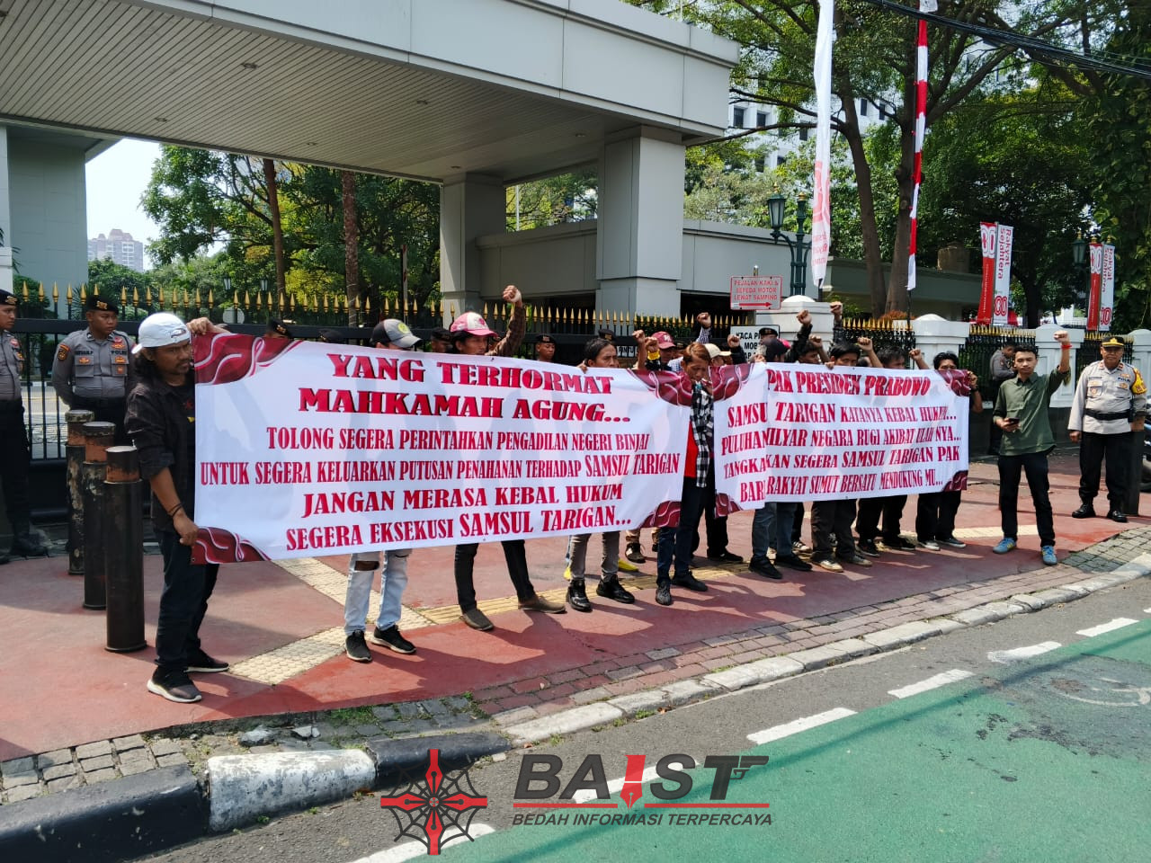 “Pak Presiden Prabowo. Samsul Tarigan katanya kebal hukum, puluhan miliar negara rugi akibat ulahnya. Tangkapkan segera Samsul Tarigan Pak. Barisan rakyat sumut bersatu mendukung mu,” tulis spanduk yang digelar di depan gedung Mahkamah Agung.